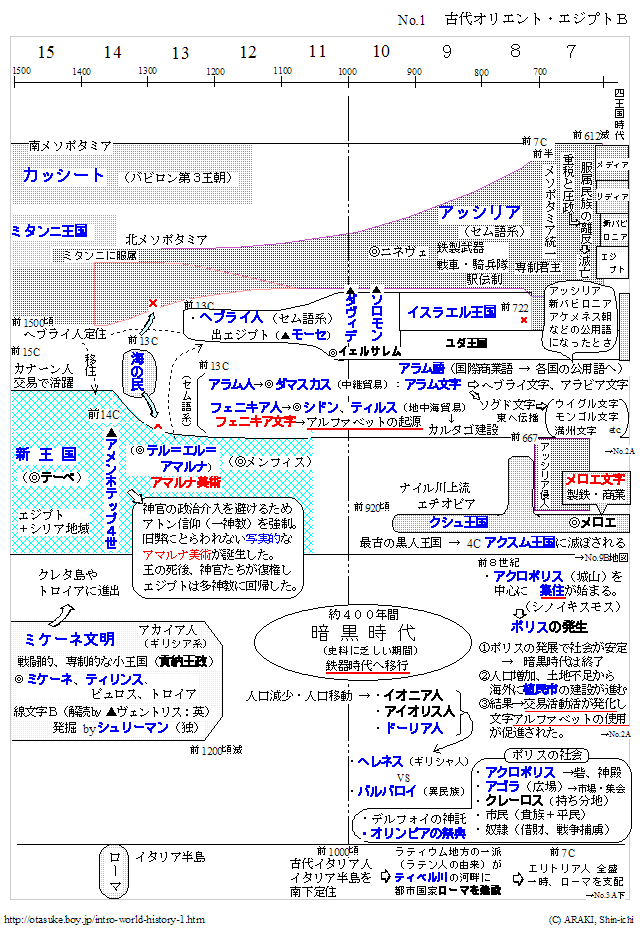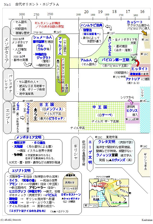 | これは(1)古代オリエント・エジプトのプリント2枚を並べたものです。 このように、1つの時代・単元(教科書で10ページくらい)を見開き2ページにまとめてあります。 各ページを少し拡大するとこんな具合です。 |