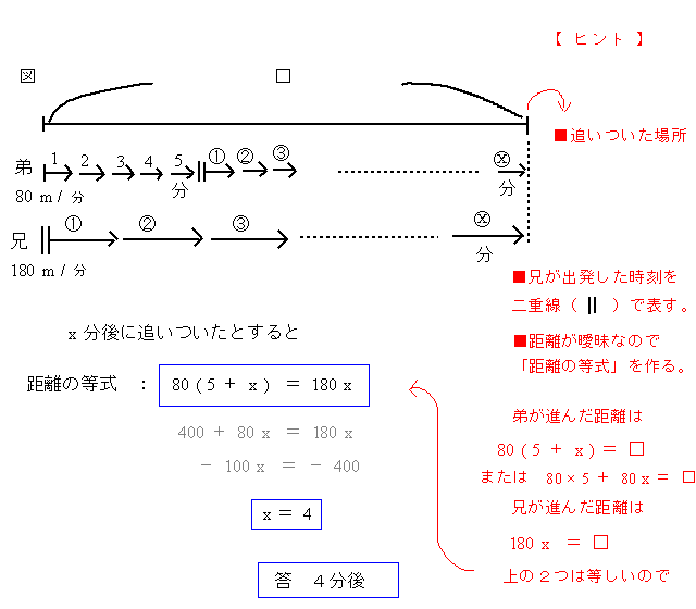 家からの距離は (兄が進んだ距離から) 180 × 4 = 720 (m) ※ このページを閉じるときは 「閉じるマーク(×)」をクリックしてください。