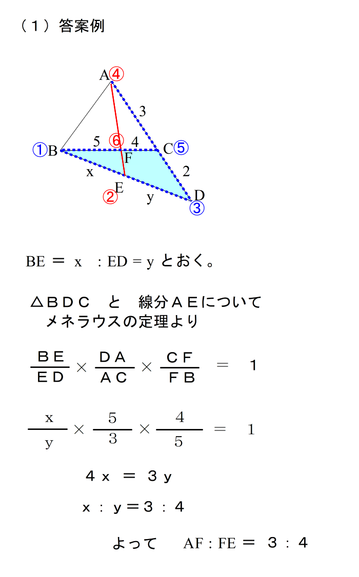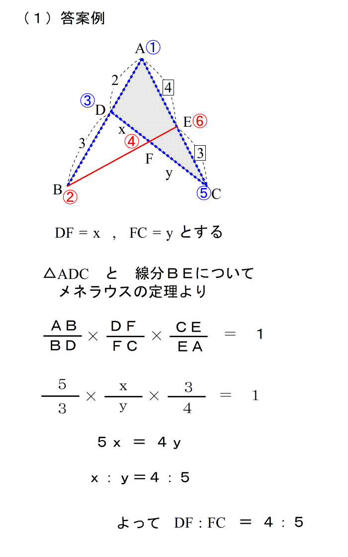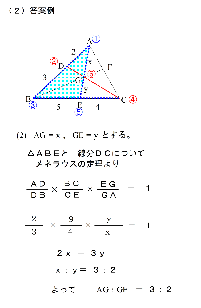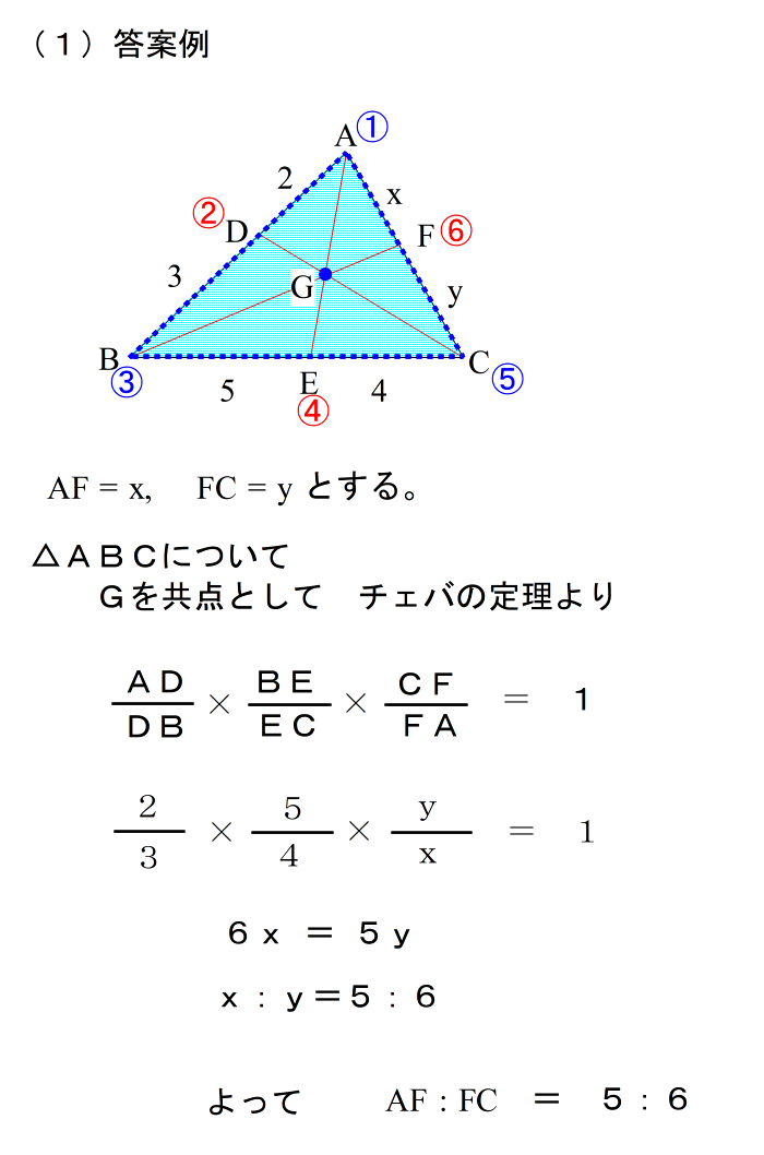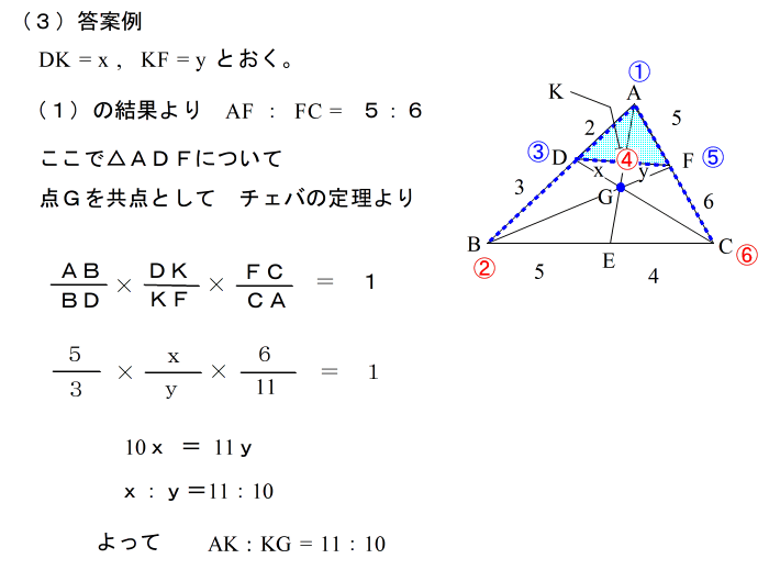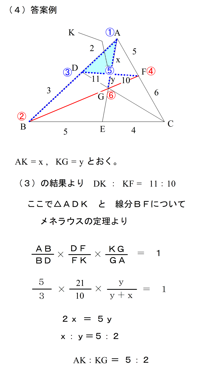 チェバ・メネラウス混合練習問題 解答 【問5】 (1) AF : FC = 5:6 (2) AG : GE = 3:2 (3) DK : KF = 11:10 (4) AK : KG = 5:2 |
