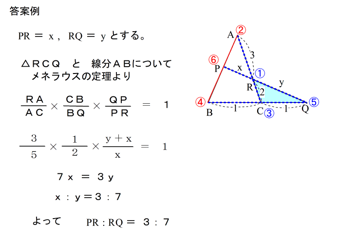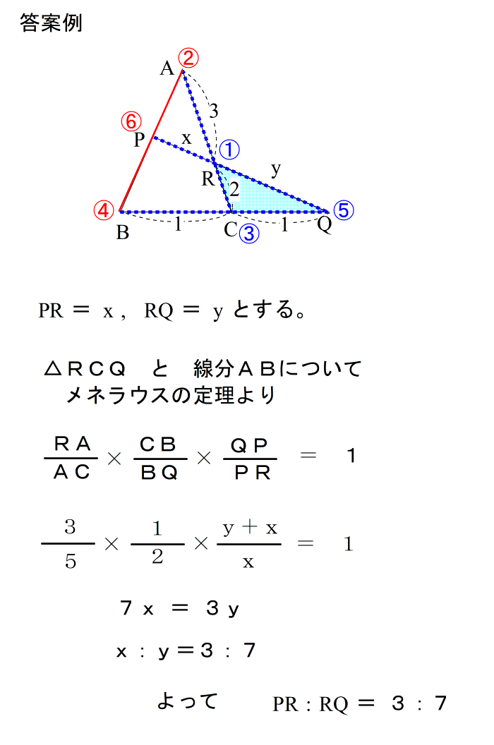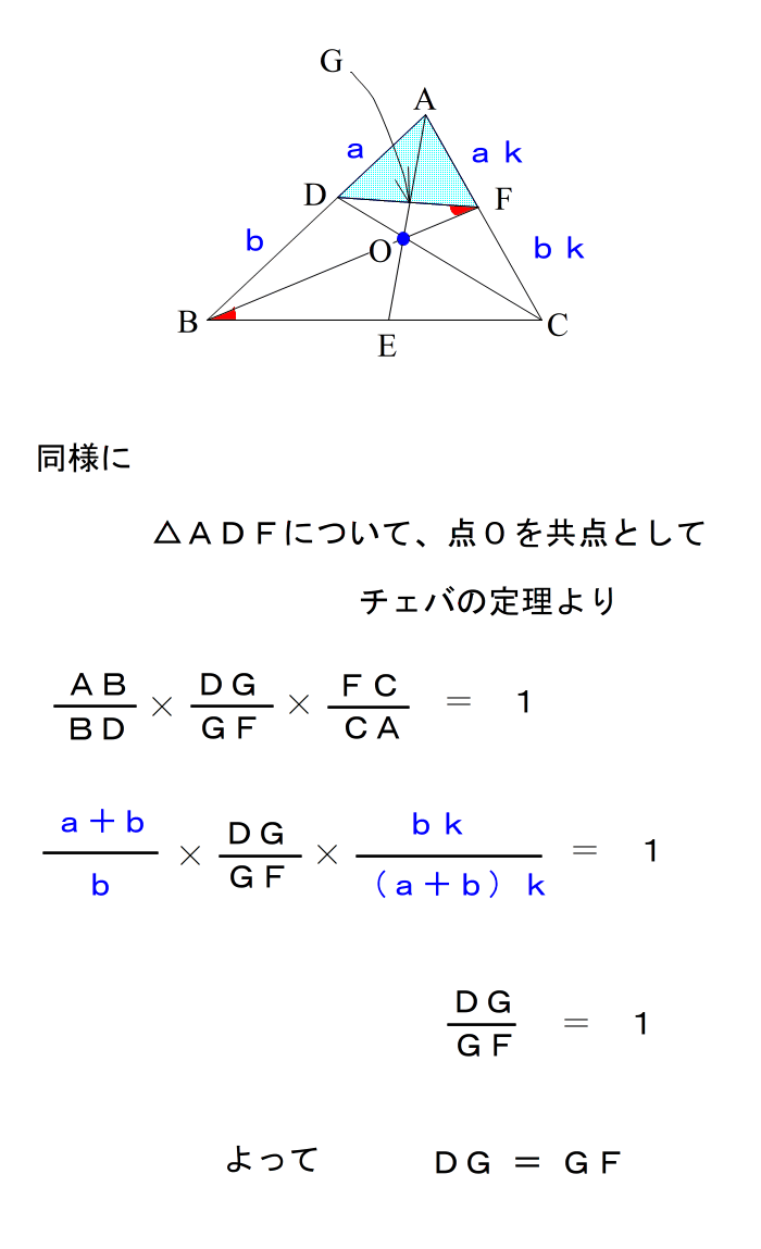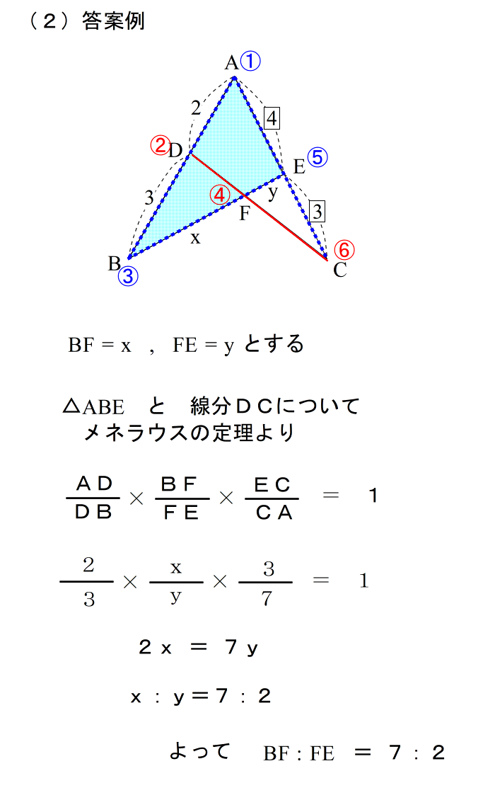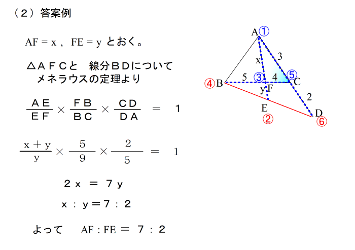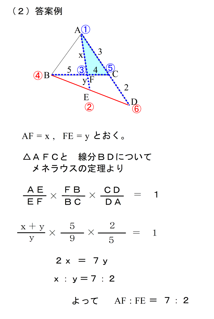 チェバ・メネラウス混合練習問題 解答 【問5】 (1) AF : FC = 5:6 (2) AG : GE = 3:2 (3) DK : KF = 11:10 (4) AK : KG = 5:2 |