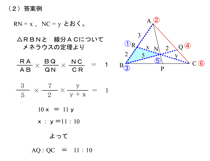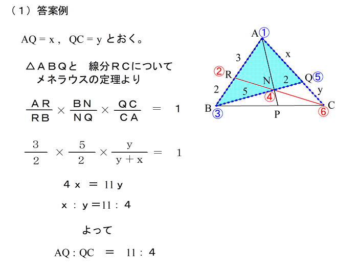 【問4】 (1)AQ : QC = 11:4 (2)RN : NC = 11:10 |